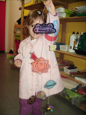 El més interessant d'haber escollit aquest material per fer els nostres móbils, és que hem experimentat el joc que es crea amb la llum a travès dels plàstics i amb els papers de seda que hem enganxat per darrere, perque els nostres planetes siguin ben colorits.