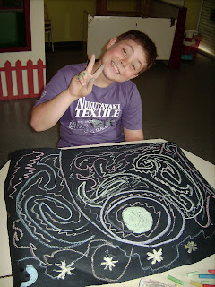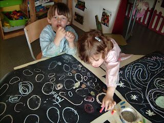 Amb uns papers negres i uns guixos de colors mullats, vam jugar damunt la superfície i els resultats van ser tan macos que tot i que l'intenció era experimentar, van quedar unes auténtiques obres d'art i no m'he pogut resistir a ensenyar-les a tothom!