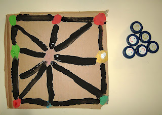 Nomès necessitem: cartró, pintura, uns taps de plàstic i una mica d'imaginació per dissenyar el nostre taulell de joc al gust dels jugadors!