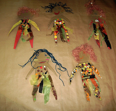 Dons nomès hem utilitzat, cartrons de les fruites per fer les cares, tubs de paper de vàter, llanes i paperets de colors i tovallons estampats per fer uns vestits ben elegants!
